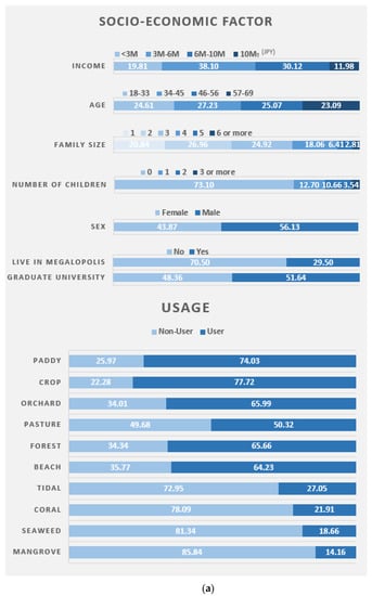 Interestingly, users of rice paddies, fields, orchards, and forests live farther away from urban parks and alternative ecosystems than nonusers. This may imply that rice paddies, fields, orchards, and forests are unique goods. In contrast, no statistically significant differences were discovered in pastures. In marine ecosystems, tidal flats, and beaches, users live closer to the coastline than nonusers. This result suggests that tidal flats and beaches are not perceived as unique goods as widespread ecosystems along the coastline since the ecosystem along the coastline provides similar ecosystem services. Surprisingly, no statistically significant differences were found among coral reefs, seaweed beds, and mangroves. In other words, one possible explanation for the spatial sorting of households’ choice of residential location is that they choose according to their preferences for particular goods [33,34]. However, it could also explain how the spatial relationship between habitat and ecosystem influences use preferences.