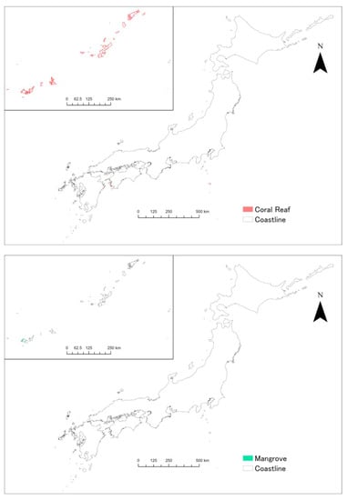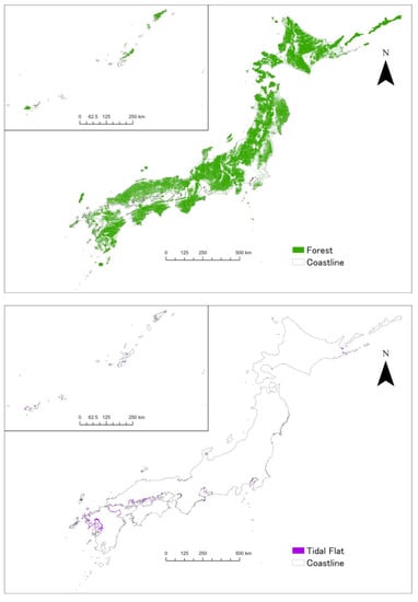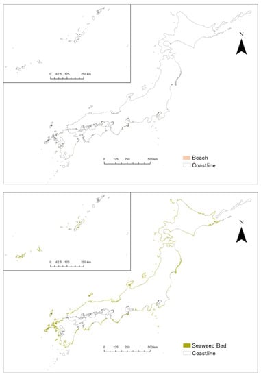 We used a geographic information system to calculate the distance between the respondent’s residence, the nearest point of 12 different ecosystems, and urban green spaces and coastlines as substitutes. The 12 ecosystems were identified and located using open-source spatial data. The information published by the Ministry of Land, Infrastructure, Transport, and Tourism was used to obtain the following data: detailed 100 m grid land-use mesh data from satellite imagery for rice paddies, fields, orchards, and pastures; forest area data for artificial forests, natural forests, and coastal disaster prevention forests; data on local resources and coastal protection facilities for beaches. Meanwhile, we obtained data from the Ministry of the Environment’s Basic Survey on Nature Conservation for tidal flats, coral reefs, mangroves, and seaweed beds. Figure 3 depicts the geographic location of the surveyed ecosystems. In this study, the habitat of tall algae such as kelp is defined as seaweed beds. Therefore, low-back algae such as eelgrass are not targeted in this study (see Supplementary Data S3 for more explicit information on the data).