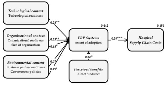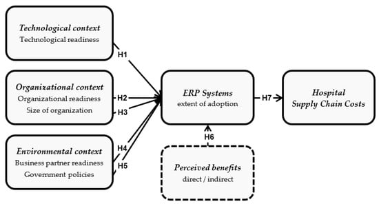 Perceived benefits, also referred to as “relative advantage” in classical innovation literature, relate to the anticipated advantages that ERP systems adoption can provide to the organization. Perceived benefits are associated with direct and indirect benefits, such as inventory cost reductions, improved patient safety, and quality of care, respectively. Although other studies chose to incorporate perceived benefits in their technological or organizational contexts, other scholars’ approaches were followed, such as Gibbs and Kraemer [] and Oliveira and Martins []. They treated perceived benefits as a separate construct since they represent the decision-makers’ personal beliefs rather than reflect the organization’s attributes. Thus, the sixth hypothesis is postulated: