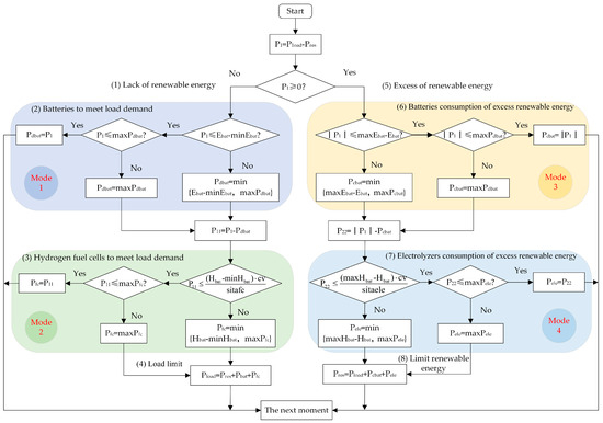 - Start the system’s energy flow at a certain time. Firstly, the unbalanced power of the system is calculated. If the wind and PV output are insufficient to satisfy the load requirements, the system will enter Operation Mode 1. Otherwise, it will switch to Operation Mode 3;