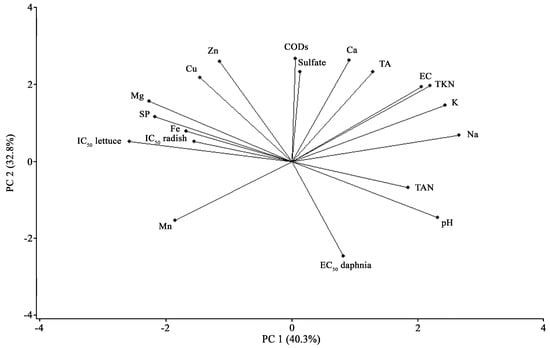 Regarding the multivariate analyses between physicochemical and ecotoxicological parameters, PCA showed a negative association between EC50 of D. magna and CODS, sulfate, Zn, and Cu. Moreover, Spearman coefficients showed that EC50 of D. magna correlated negatively to CODS (R = −0.70; p ≤ 0.01) and sulfate (R = −0.70; p ≤ 0.01). PCA showed a positive association of IC50 of R. sativus and L. sativa with SP, Fe, and Mg, but showed a negative association with TAN, Na, K, TKN, pH, and EC. In addition, IC50 of L. sativa correlated negatively with Na (R = −0.73; p ≤ 0.05), and positively with Mg (R = 0.76; p ≤ 0.05).