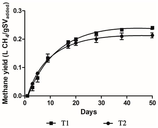 In the BMP test, the cumulative production of methane was 408 ± 9 and 580 ± 44 mL for T2 and T1, respectively (Figure S1). No significant differences (p > 0.05) were observed between treatments for this parameter. The methane yields obtained were 0.25 ± 0.05 L CH4/g VSadded and 0.21 ± 0.02 L CH4/g VSadded for T1 and T2, respectively. T1 showed 13% more methane yield than T2, although no significant differences were observed between treatments (p ≤ 0.05) (Figure 2). Better performance was found with low pig slurry load, i.e., T1 was greater than T2 from day 13 to the end of the test. Although the difference in CODT values between treatments was double, the difference in CODS represented a higher proportion (Table 4).