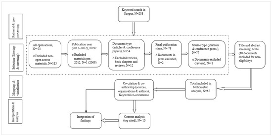 The advanced search function was used to retrieve 208 documents using the keywords “sustainable facilities management” and “built environment.” Documents were limited to “all open access” and the eleven-year (2012–2022) period. The search elicited journal articles and conference papers published in the following years: 2009, 2012, and 2014–2022. To ensure that relevant and current knowledge was included, the 2009 document was removed. Thus, pre-2012 (N = 1), as shown in Figure 1, was removed. The period was limited to obtaining relevant materials and their current contribution to the sustainability debate. This was to capture as much recent literature as possible given the increasing relevance of sustainability in facilities management, the futuristic nature of the topic, and the need to examine contemporary issues to inform further research directions. Therefore, studies from 2012 to date were retained and used for the bibliometric analysis.