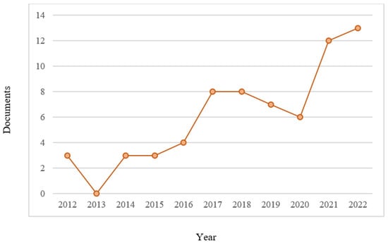 The study examined the publication history of SFM research between 2012 and 2022. Over the years, as shown in Figure 2, publications increased steadily from 2014 to 2017, dropped in 2019 and 2020, and increased again exponentially in 2021. This sharp increase could be attributed to the increased focus on health and wellbeing post-pandemic. One 2013 document indexed in Scopus was a book chapter by Tucker, M., which was excluded from the bibliometrics based on the criteria. It is evident that sustainability research in facilities management is growing year after year.
