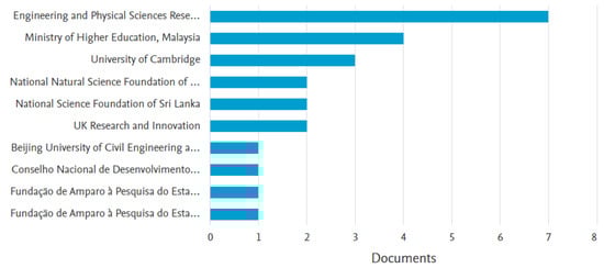 Over the period investigated, there was funding for SFM research in the built environment. These included public bodies and higher education institutions. The top funders were the Engineering and Physical Sciences Research Council (EPSRC) in the UK (seven documents), the Ministry of Higher Education in Malaysia (four documents) and the University of Cambridge, UK (three documents) (Figure 3). These correspond with the results of the highest publication outputs from the UK and Malaysia. Thus, supportive funding increased productivity in the SFM research field in these countries.