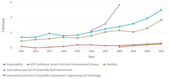 The top five sources responsible for the publication of 42% (28) of the papers were Sustainability (8), IOP Conference Series: Earth and Environmental Science (7), Facilities (6), International Journal of Sustainable Built Environment (3), and International Journal of Sustainable Construction Engineering and Technology (4). The CiteScore of the journals is shown in Figure 4. The CiteScore reflects the yearly average number of citations to recent articles published in the journals. Sustainability and Facilities had the highest and most stable CiteScore metrics over the years investigated.