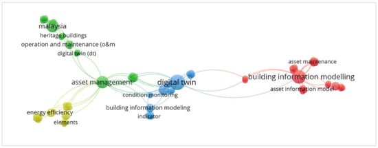 Keeping the minimum TLS at 3, the top keywords were analysed. Terms including sustainable development, facilities management, sustainability, and facility management were also excluded as they appeared mostly given the general search scope [35]. For each of the remaining 178 keywords, the frequency of occurrence was established. The most frequently occurring keywords were digital twin (6), building information modelling (5), asset management (4), sustainable development (3), anomaly detection (3), building information modelling (2), energy efficiency (2), and sustainability assessment (2). Alternatively, the least occurring keywords (appearing only once) were public universities, public buildings, life cycle costing, workplace indoor environmental quality, Green Star post-pandemic, machine learning, and LEED, among others. Some of these concepts, for example, green star accreditation and LEED (Leadership in Energy and Environmental Design), appeared in research in the 2000s, as reported by Brochner et al. [6].