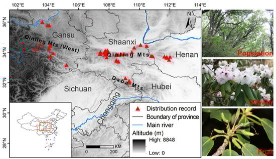 Rhododendron (Ericaceae) is a species-rich genus with more than 1000 species globally [9]. It is the largest genus of woody plants in the Northern Hemisphere, including many horticulturally valuable species. There are about 571 Rhododendron species in China, and many species are endemic and threatened [10,11]. As a keystone element of montane ecosystems, many Rhododendron species represent the dominant or constructive elements in the subalpine and alpine plant communities. They play a vital role in delivering ecosystem services of slope stabilization and watershed protection, as well as in supporting biodiversity [8]. Therefore, Rhododendron has been suggested as an ideal system for ecological and evolutionary studies [11,12,13]. In the past, most related studies on Rhododendron species have focused on the Himalaya–Hengduan Mountains, which is a center of diversity and diversification in the genus [5,12,13,14]. The Qinling-Daba Mountains region (QBM) of central China is also referred to as one of the biodiversity hotspots for Rhododendron in China [15]. However, few studies have been undertaken concerning the ecology and conservation of Rhododendron species restricted to this region.