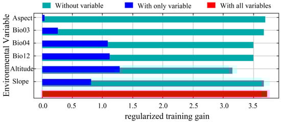 The importance evaluation of the six environmental variables related to R. purdomii distribution by using the jackknife method.