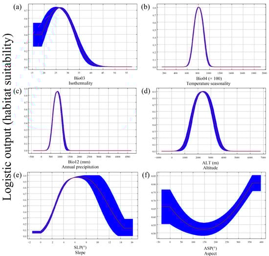 Response curves of the main environmental variables. Isothermality (a); temperature seasonality (b); annual precipitation (c); altitude (d); slope (e) and aspect (f). The red curves show the mean over 10 replicate runs, and blue bands show the standard deviation.