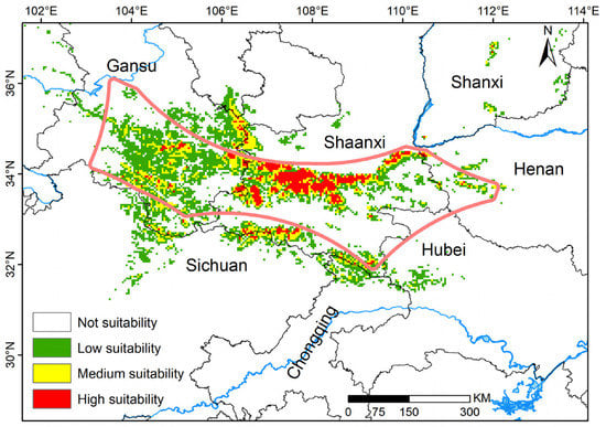 The current potential distribution of R. purdomii was primarily located in the QBM, including southern Shaanxi, southeastern Gansu, western Henan, northwestern Hubei, northeastern Chongqing, and northeastern Sichuan (Figure 4). The total suitable area amounted to 10.43 × 104 km2. In particular, the low-suitable area occupied more than half (65.77%) of the predicted suitable area. Conversely, the high-suitable area only accounted for 11.41% of all the suitable area (Table 3).