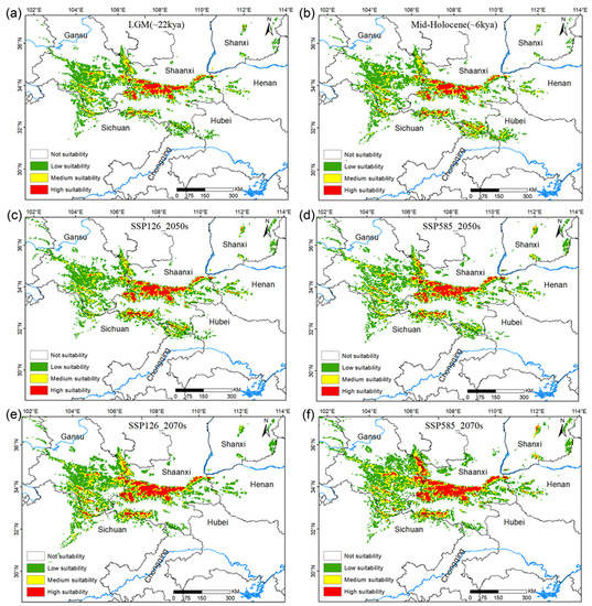 Potential distribution and changes under the LGM, Mid-Holocene, current, and future scenarios are presented in Figure 4, Figure 5 and Figure 6 and Table 3. From the past to the future, the suitable distribution areas of R. purdomii showed a trend of expansion, except under the SSP126 (2050s) scenario. Under different scenarios, the low-suitable areas occupied more than half (62.54–67.66%) of the predicted suitable areas, whereas the high-suitable areas only accounted for 10.24–15.37% of all the suitable areas (Table 3).
