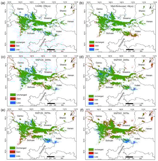The predicted changes in the suitable areas of R. purdomii under different climate scenarios compared to the current condition. LGM (a); Mid-Holocene (b); SSP126_2050s (c); SSP585_2050s (d); SSP126_2070s (e); SSP585_2070s (f).