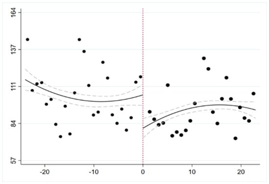 With regard to the execution variable, this study used the sample non-random test method proposed by Bugni to verify whether the execution variable had an accurate manipulation effect near the critical value, by constructing the statistics of the order [19]. Compared to other methods, this method can be more asymptotically effective under weaker conditions. When the execution variable meets the continuous distribution, it satisfies the local randomization assumption of RDD. The original hypothesis of this test was that the density function of the executive variable is a continuous function at the critical value. In this study, the executive variable is (i.e., the number of months before the establishment of the pilot zone); the test results are shown in Table 5. The results show that the p-value of the regression discontinuity non-random test of these samples at the critical value was 0.160. This implies that the null hypothesis cannot be rejected; it also indicates that the density function of the executive variable is a continuous function at the critical value, and there is no human intervention.