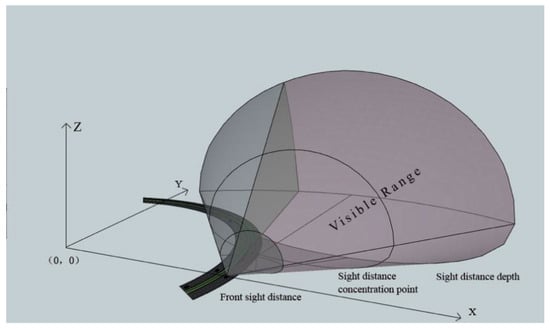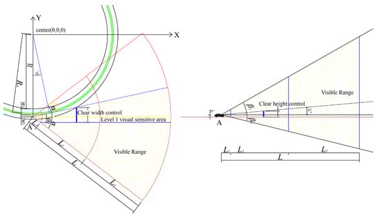 The design speed v and the radius R of the curve are taken according to the regulations in the “Design Specification for Highway Route 19” (JTG D20-2017). The horizontal viewing angle α [20], the vertical viewing angle β [21], the front visual distance L1 [21,22], the point L2 [21,22] and the visual distance depth L3 [21,22] take values from Table 1. The vertical viewing angle β1 on the vertical field of view is 30° [23], and the viewing distance L is valued according to the depth of the viewing distance [22]. The apparent height h is taken as a value of 1.2 m for a car.