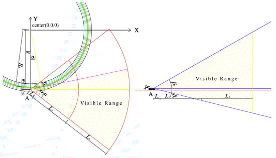 As shown in Figure 2, taking the center of the circular curve of the highway as the origin (0, 0, 0), the coordinates of the point A where the driver is located are (0, −(R + w1 + w2), h); at the same time, taking the viewing plane as the reference plane, the visual field volume of the roadside landscape at point A is: