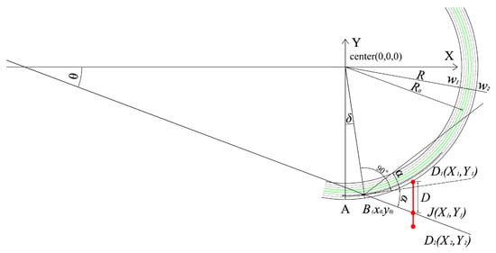 As shown in Figure 5, it is assumed that the vehicle travels to the point B(x0, y0) of the curve, and the top view of the occluder is equivalent to a line segment, and its two ends are D1 (x1, y1) and D2 (x2, y2). If the coordinates of D1 and D2 use the spatial coordinates assumed by the occluder, namely, D1 (xz, yz, zz) and D2 (xz, yz– D, zz), then the occlusion width Dj can be obtained by calculating the intersection point J(xj, yj).