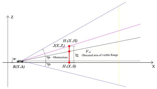 As shown in Figure 6, it is assumed that the vehicle travels to the point B(x0, h) of the curve, and the straight view of the occluder is equivalent to a line segment, and its two ends are H1 (x1, H) and H2 (x2, 0), the occlusion width H can be obtained by finding the intersection point J(xj, zj).