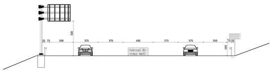 According to the “Technical Standards for Highway Engineering” (JTG B01-2014) [18,19], the road width of the highway is the standard value, so that it is a universal reference value to select the G4 Highway Hunan section for this study. To this end, the cross-section width of the G4 Highway as shown in Figure 7 is selected for verification, in which the width w1 from the edge of the inner curve roadbed to the outer edge of the outer curve of the middle belt is 16.25 m, and the width w2 from the outer edge of the outer curve of the middle belt to the coordinate position of the car is 5.625 m.