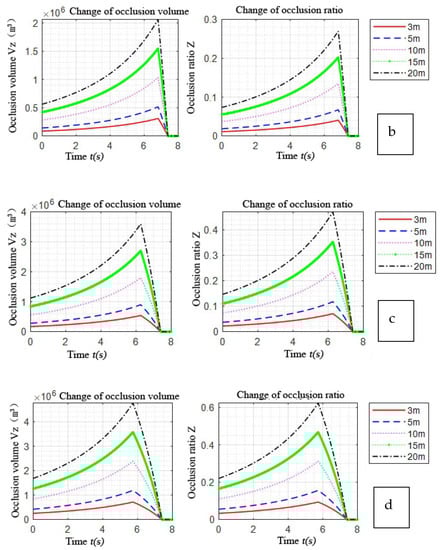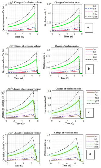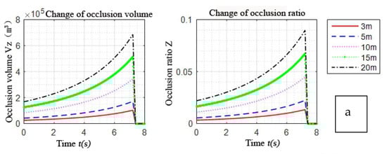 For the change of the occlusion volume and the change of the occlusion ratio, the larger the width of the occlusion object, the higher the height, and the longer the occlusion time. The occlusion process becomes an inverted “V” shape change; and from the occurrence of occlusion to the occurrence of the peak values of the occlusion volume and occlusion ratio, it takes 6 to 8 s.