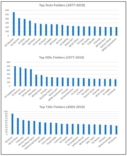 Cricket analysts and the ICC often compile and maintain a list of top performers at each player’s career end. It is based on absolute performance measurements like the number of runs scored by batters, the number of wickets taken by bowlers, and run-outs and catches taken by a fielder. Figure 1, Figure 2 and Figure 3 show the top 20 performers in all three departments of cricket (batting, bowling, and fielding) for Test, ODIs, and T20s (from 1877–2019). However, these performances are only output-oriented and do not show the actual depth of a player’s efficiency, as it does not count the other input indexes like balls faced or bowled, averages, economy, and the strike rates of a player throughout his career. Therefore, our study employed multiple input–output indexes (described in Table 1) to evaluate the actual Efficiency of Players [29].
