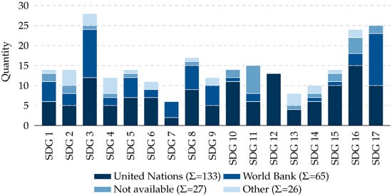 The SDGs consist of 17 main goals [2] covering all three pillars [15] of sustainability. Wackernagel et al. [16] highlighted the relevance of the SDGs due to existing international consensus on them and claimed that transparent monitoring is a crucial factor for the successful implementation of the SDG goals. The UN divides these goals into 169 targets linked to 232 unique indicators. The open-source project SDG-Tracker provides a platform for gathering data for each of these indicators (if available) on a country level [17]. Analyzing the SDG-Tracker’s data sources, we found that only 4 of the 232 SDG indicators provide data for smaller regions than countries. The list of data sources is provided as Supplementary Information. Data often come out of surveys, and data acquisitions are mostly commissioned on a national level. Accordingly, the majority of the data are published by global organizations, such as the UN or the World Bank, as shown in Figure 1.