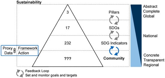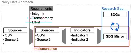 We concluded that there is a trade-off between global sustainability indicators and regional stakeholder interests (Section 2.1). Our approach aims to resolve this trade-off by using open-source and community-based data to derive local sustainability impact comprehensively and engagingly, linking local impact to the existing SDG indicators. The approach’s novelty is its easy scalability combined with a higher spatial resolution than currently found in the literature. Therefore, our approach relies on proxy data, linking publicly available metrics (e.g., OpenStreetMap (OSM)) to overall sustainability.