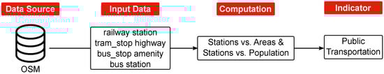 To obtain the number of public transportation stations , we used OSM as the data source. Figure 4 summarizes the data collection and computation required to calculate the score.