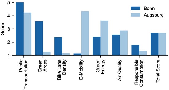 With this work, we presented a novel approach to measuring sustainability. One of our key findings is the approach’s overall plausibility. Sampling two cities (Bonn and Augsburg), we showed that the Sustainability Mirror adequately represents environmental- and urban-planning-related SDGs. Based on this sample, we verified the methodology’s results. Comparing the cities’ sustainability reports, we found that the Sustainability Mirror reflects certain economically sustainable-related aspects. However, we were not able to clearly correlate these aspects, which is why future research should supplement the Sustainability Mirror with other sources in these areas.