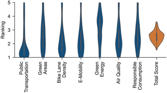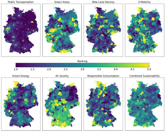 We define a combined index taking seven sub-indices into consideration: public transportation, green areas, bike lane density, e-mobility, green energy, air quality, and responsible consumption. All the indices were calculated on an administrative Nomenclature of Territorial Units for Statistics (NUTS) V.3 grid for Germany, to segment areas into regions that include between 150 and 800 thousand inhabitants [75]. We obtained a rating by pre-processing every aforementioned indicator for every county in Germany. To remove outliers, we clipped the rating of each indicator by just considering the 95th percentile and setting the outliers to the closest included rating value. Finally, to calculate the final scores, we linearly rescaled the ratings from 1 to 5, making them comparable with each other.