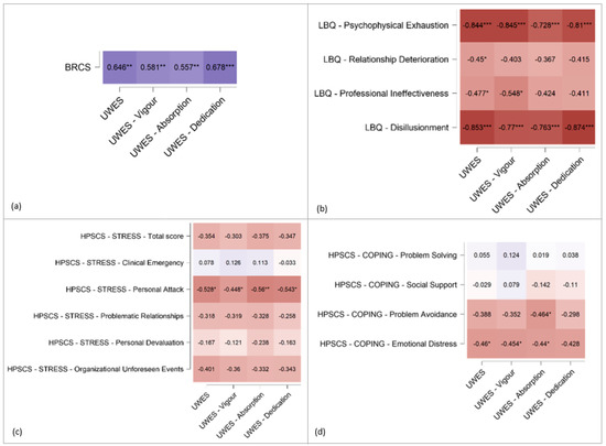 Correlations between UWES score and other variables. (a) UWES and BRCS correlations. (b) UWES and LBQ correlations. (c) UWES and HPSCS-STRESS correlations. (d) UWES and HPSCS-COPING correlations. Color intensity represents the correlation strength: blue colors = positive correlations, red colors = negative correlations. * p < 0.05, ** p < 0.01, *** p < 0.001.