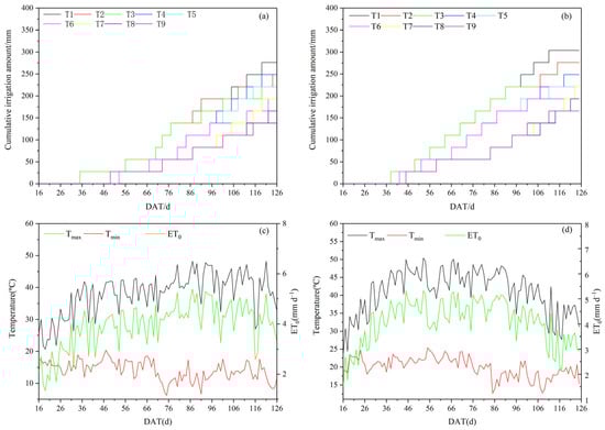 Figure 1. Cumulative irrigation volume, temperature and reference crop evapotranspiration (ET0). Where, (a,b) represent cumulative irrigation volume for each treatment in the 2020 and 2021 growing seasons, respectively. Meanwhile, (c,d) represent temperature and ET0 in the 2020 and 2021 growing seasons, respectively.