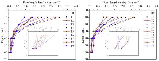 Figure 2. Distribution of the water-absorbed root length density of tomato in 2020 (a) and 2021 (b) under deficit irrigation. The graph in the figure is an enlargement of the water-absorbed root length density of the underlying soil.