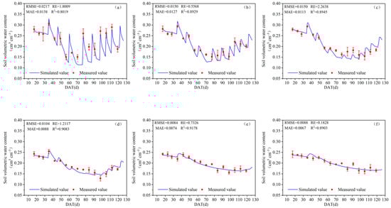 In order to simplify the model simulation process, the Hydrus-1D model was used to simulate soil water movement without considering root growth. The simulation result for the SWC of the greenhouse tomato, obtained using the Hydrus-1D model without considering root growth, is shown in Figure 6. Combined with Figure 4 and Figure 6, except for the RE of 0–10 cm, the RMSE, RE and MAE values for the predicted and observed SWC of each soil layer with root growth considered were all smaller than the simulation results without considering root growth, while R2 showed the opposite trend. The results showed that the simulation effect of the Hydrus-1D model could be further improved by considering tomato root growth under membrane deficit drip irrigation. The reason may be that the root growth depth of crops in different growth stages under deficit irrigation was different, which led to changes in the range of RWU and the distribution of soil water, and the simulation accuracy of the model was further affected [56].