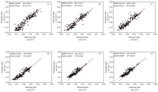 Figure 4. Predicted and observed values of SWC for validation at different soil depths and related model evaluation indexes. Where, (af) represent 0–10 cm, 10–20 cm, 20–30 cm, 30–40 cm, 40–50 cm and 50–60 cm soil layers, respectively.