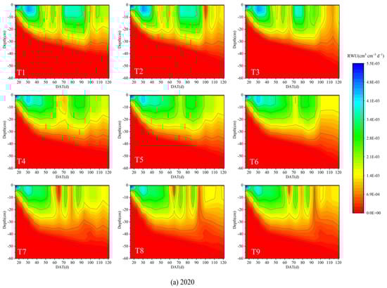 3.3. Spatio-Temporal Distribution of RWU under Deficit Irrigation
