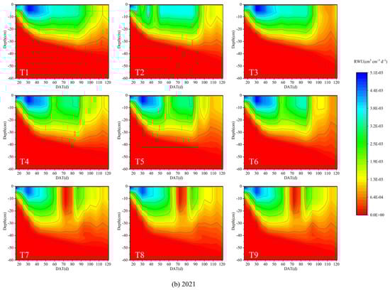 Figure 5. The dynamics of the RWU rate of tomato at different soil depths in 2020 (a) and 2021 (b).