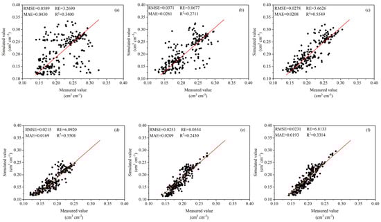Figure 6. The predicted and observed values of SWC without considering root growth and the related model evaluation indexes. Where, (af) represent 0–10 cm, 10–20 cm, 20–30 cm, 30–40 cm, 40–50 cm and 50–60 cm soil layers, respectively.