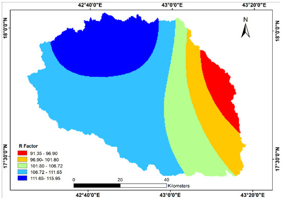 - R factor calculated using CHIRPS data was found very high in the mountainous regions, which showed a decreasing trend towards the steep slope of the study region. The distribution of R factor demonstrated that Wadi Baysh is extremely vulnerable to soil erosion, especially the northern areas of the basin. Overall, the average values of R factor range from 91.35 to 115.95 MJ mm/ha/h/year in the study area.