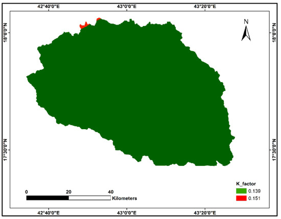 Figure 4 shows the spatial variation of K values in Wadi Baysh, where its values range from 0.139 to 0.151 t ha h/ha M.J. mm, indicating low-to-moderate soil erodibility. The K factor is divided into two classes, i.e., high (green color) and low erodibility (red color). Table 3 shows soil type, soil texture, and K values in Wadi Baysh. The K values are calculated using Equations (3)–(7). The first type of soil class consists of 58.9% sand, 16.2% silt, 24.9% clay, and 0.97% organic carbon. In contrast, the second class is comprised of 75% of sand, 15% silt, 10% clay, and 0.31% organic carbon. Soils with higher K values are more vulnerable to soil erosion. However, lower K values are more resistant to soil erosion.