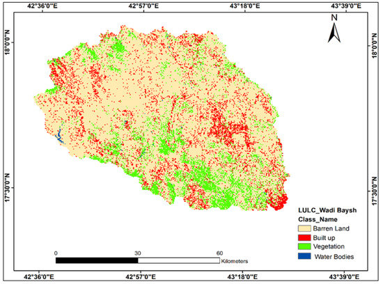 - The study area is classified into four major LULC classes, i.e., barren land, built-up, vegetation, and waterbodies. The study area comprises 81%, 11%, 8%, and 1% of barren land, vegetation, and water bodies, respectively.