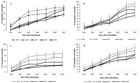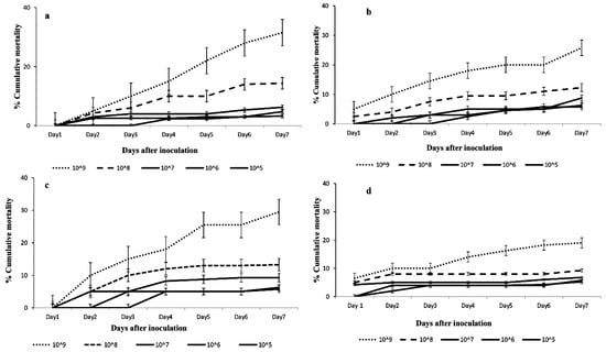 Cumulative mortalities of 2nd instar larvae of FAW infected with Metarhizium anisopliae: (a) ICIPE 7, (b) ICIPE 41, (c) ICIPE 78 and Beauveria bassiana, and (d) ICIPE 621 at different concentrations. Line graph points denote means ± standard errors.