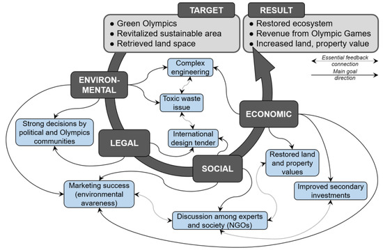 The largest documented dump in the world had been operating since the 1950s at its location in New York Staten Island, mainly in a landscape that was a salty marsh. The amount of waste gathered there from New York City and its vicinity was estimated at 26,300 metric tons of garbage every day. Waste dumping resulted in 136 million metric tons of solid waste spread over 931 ha [36]. An international revitalization design tender with the involvement of the community led to the idea of creating green space: Freshkills Park [36,37,38,39]. Analysis of this case revealed that the main concerns for residents and authorities were health and environmental issues, and only afterwards possible resource reuse and property prices gained significance. The main spatial intervention for dump reclamation to make the public park was performed by transformation through ecological renewal, applying methods often used in the ESE approach. Apart from defined main revitalization targets and results, co-benefits were reached to address local issues and respond to future ESE demands. Multiple effects of environmental, social, political and economic interests’ integration in the dump transformation process were identified (Figure 3). Regarding the ESE approach, obviously, a wide range of experts was involved, and local community consultations and information dissemination were performed to develop the revitalization masterplan [85,86] in line with the set of biophysical ESE implemented by indirect measurements (expert-based estimation), direct measurements (field observation, monitoring data) and sociocultural ESE realized by society’s involvement and detailed management plan analysis.