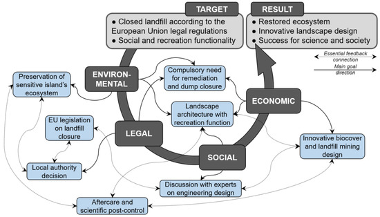 Basically, the real estate potential estimation, meaning the value of the land whether it is degraded, contaminated or legally restricted to be used for broader purposes from the ecological point of view, is dependent on fundamental analysis of market trading transactions in the selected area. As the land assets never relate to short-term investments, the legal issues may be disregarded and revitalization expenses may be subtracted from the land value. That can lead to accumulated wealth in the future if the land is used for multiple purposes. Property buying and selling transactions at the very moment may give an insight into how much the land would cost if remediated and legal and/or ecological restrictions are taken away. However, in most cases, abandoned dump sites need to undergo remediation anyway; therefore, the calculation requires a comparison of the options for remediation technologies and planning the risks of legal obstacles for the reuse of the land in the nearest future [96,97]. After the analysis of case studies, four main directions of gained benefits from landfill revitalization were distinguished—economic, environmental, esthetic and legal (Figure 7). They may serve as a basis in the universalization of potential pros and cons assessment if a revitalization project is planned to be performed, whether the degraded site is large or medium-sized.
