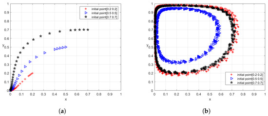 Then, we present the results of the dynamic premium policy. Figure 3a illustrates that when retailers offer the dynamic premium for the green product, the dynamic evolutionary process between retailers and farmers presents a spiral convergence. Figure 3b shows that the evolution of populations fluctuates greatly at first and levels off eventually. Both of these two figures indicate that , is the asymptotically stable equilibrium point of the replicator dynamic system (2), and Proposition 2 is verified.
