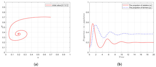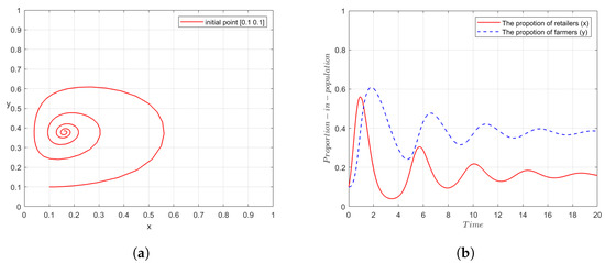 Finally, we present the results of the dynamic premium and farmers’ punishment policy. Figure 5a demonstrates that the dynamic evolutionary process between retailers and farmers presents a spiral convergence, and , is the asymptotically stable equilibrium point of the replicator dynamic system (3). Figure 5b shows that the evolution of populations fluctuates greatly at first and levels off eventually. These results are consistent with the theoretical model results.