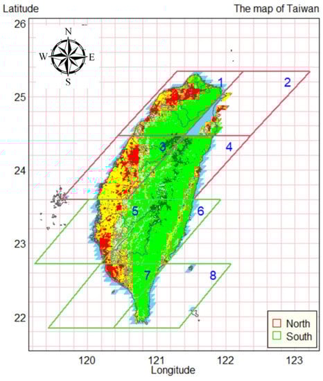 The study area, which occupies the entire Taiwan area, was divided into eight super-regions as shown in Figure 1. The area of each super-region is 105 km × 105 km, and they were separated into two parts, each of these consisting of four super-regions: (i) the northern region, consisting of super-regions 1 to 4, and (ii) the southern region, consisting of super-regions 5 to 8.