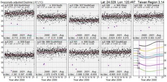 Figure 3 shows the trends in daytime LST estimated from the linear models between the North and South parts of Taiwan, categorized into five trends represented by different colors: (i) green represents a stable trend, (ii) red an accelerating increased trend, (iii) light blue a decelerating increased trend, (iv) dark blue a decelerating decreased trend, and (v) pink an accelerating decreased trend. The plots were further categorized into binomial terms, acceleration (accelerating increase or decelerating increase) and nonacceleration curves based on the overall change of LST, i.e., whether it was positive or negative. Figure 4 below shows a scatter plot of the average accelerating increase of daytime LST (°C/decade2) and the average daytime LST increase (°C/decade) in each sub-region.