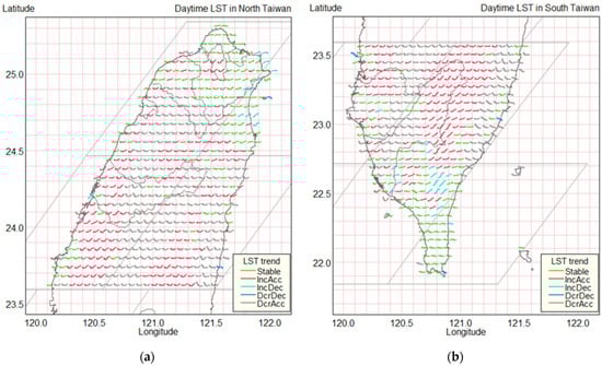 Daytime LST trends in Taiwan: (a) in the North; (b) in the South. Note: IncAcc is accelerating increase, IncDec is decelerating increase, DcrDec is decelerating decrease, and DcrAcc is accelerating decrease.