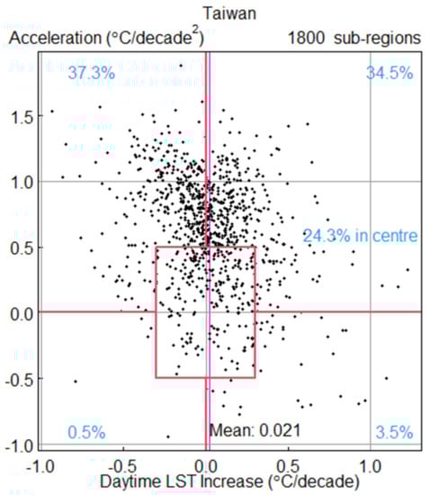 Figure 4 presents the estimated acceleration and deceleration in the increase of daytime LST in Taiwan over the past 21 years and summarizes the trends per decade. The vertical, horizontal, and square lines in red delineate separate categories of temperature change from zero defined by the combination of temperature (increase or decrease on the X-axis, and acceleration and deceleration on the Y-axis) from which the choropleth map above, in Figure 3, was created. The trends in surface temperature in Taiwan have had an accelerating decrease trend (37.3%) for all sub-regions, followed by an accelerating increase of 34.5%, a stable trend (24.3%), a decelerating decrease trend (0.5%), and a decelerating increase trend (3.5%). The pink vertical line shows an overall temperature increase of 0.021 °C per decade.